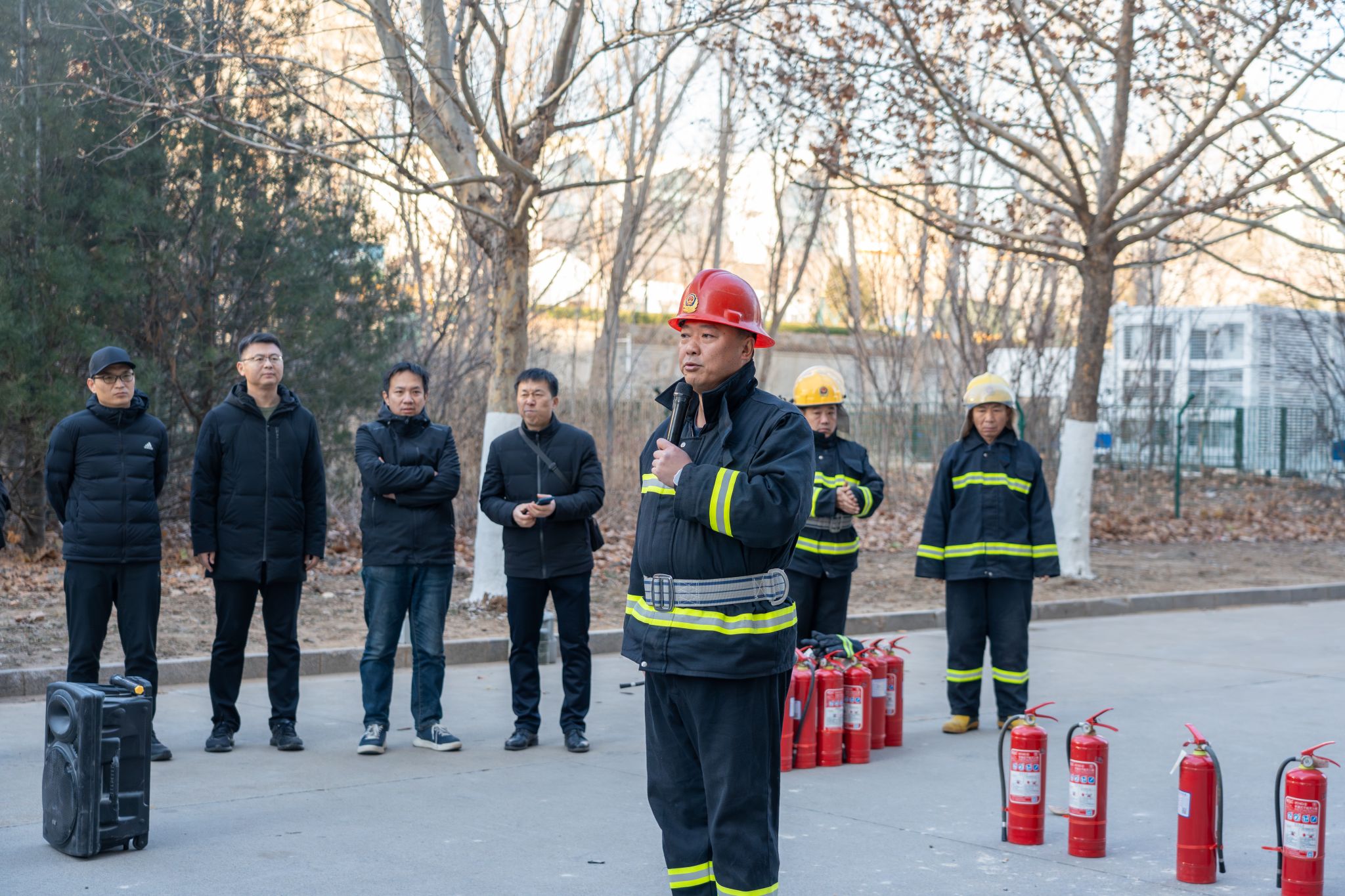 随着警报声响起,整个教学楼迅速进入应急状态。公司领导启动应急预案,拨打7110报警电话联系安全保卫处,切断楼内电源并组织教职工有序撤离。正在教学楼内的全体师生在志愿者的有序引导下,沿着预设的疏散路线快速撤离。仅用不到3分钟,全体人员便成功撤离至安全区域。随后,公司领导现场强调了加强安全工作、排查安全隐患、防范火灾等安全事故的重要性,提醒大家警钟长鸣。安全保卫处李鹏老师为教职工介绍了灭火器的不同类型、正确使用方法以及关键注意事项。师生们也积极地投入到灭火实操练习中。这次实操演练不仅直观展示了灭火器的效果,而且极大地增强了大家的灭火实战能力和应急自救水平。