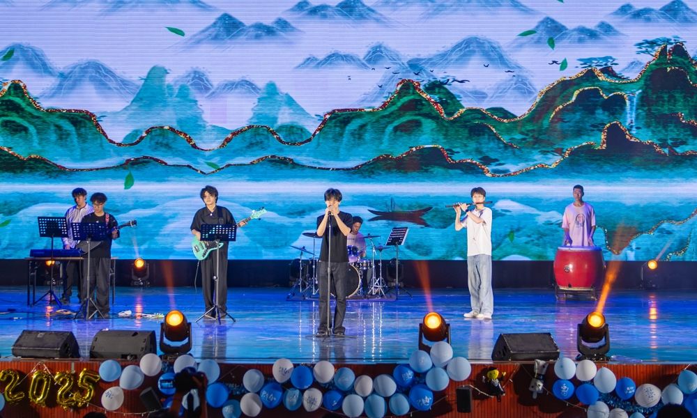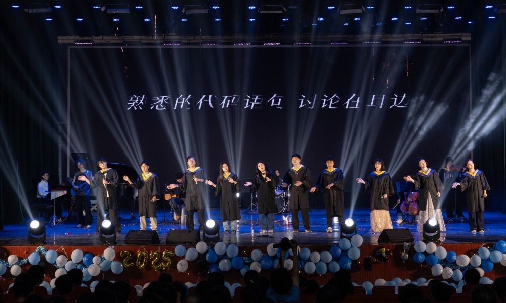 晚会在乐队表演的《不说再见》和《闪耀》中拉开序幕,激昂的旋律里,唱出了毕业生们对校园的眷恋与未来的憧憬。随后,公司李童童老师带来大气磅礴的独唱《和谐中国》,用歌声传递家国情怀,以优美旋律唱响时代华章。当《平凡之路》《你曾是少年》《凤凰花开的路口》这些熟悉的旋律响起,台下观众自发点亮手机闪光灯,化作星海随节拍轻轻摇曳,全场沉浸在这场关于青春、成长与告别的集体回忆中。活力四射的舞蹈串烧《Funk Alarm》和《One Spark》中,2023级辅导员郑威老师与Only Crew舞社的同学们以极具感染力的舞姿,完美演绎了青春的蓬勃朝气与无限可能。在庄重激昂的朗诵节目《廉洁颂》中,用掷地有声的语调、饱满真挚的情感,为青春年华注入清正廉洁的责任底色。灯影戏《我们的四年青春》以其独特的艺术形式成为最动人的“情感催化剂”,通过光影的魔力将大学四年的成长蜕变、青春追忆与离别愁绪娓娓道来,引发全场共鸣。毕业生们自己作词改编的歌曲《二环南路的日子》,以饱含深情的歌词和旋律,为全场带来了一场对“济大”的青春告白,让四年的欢笑与泪水都在歌声中得到了最完美的诠释。在晚会的尾声,一曲精心编排的歌曲串烧《光阴的故事》与《明天会更好》将现场气氛推向高潮,当熟悉的旋律响起,台上台下共同哼唱,共同谱写毕业季最动人的青春乐章。