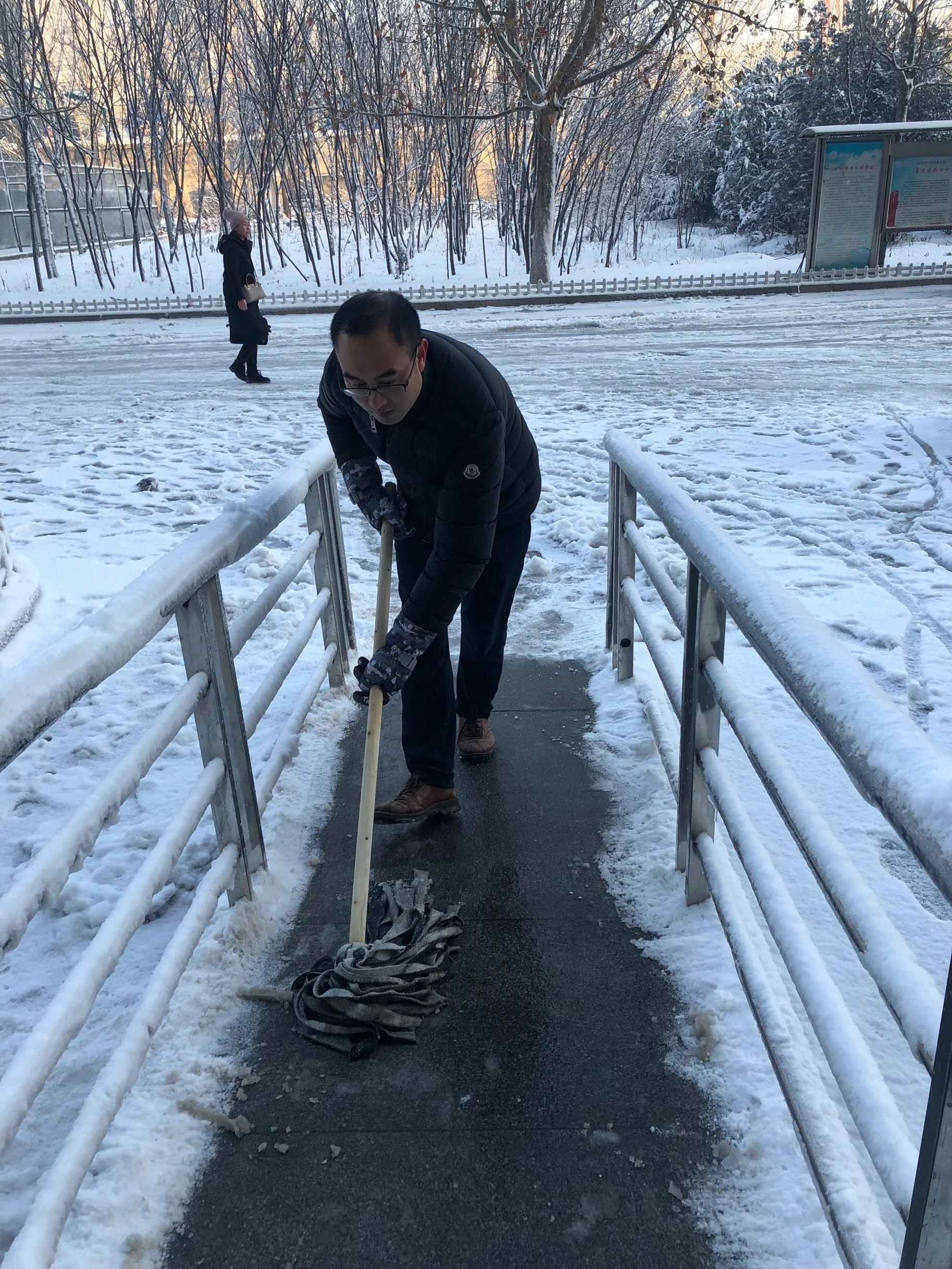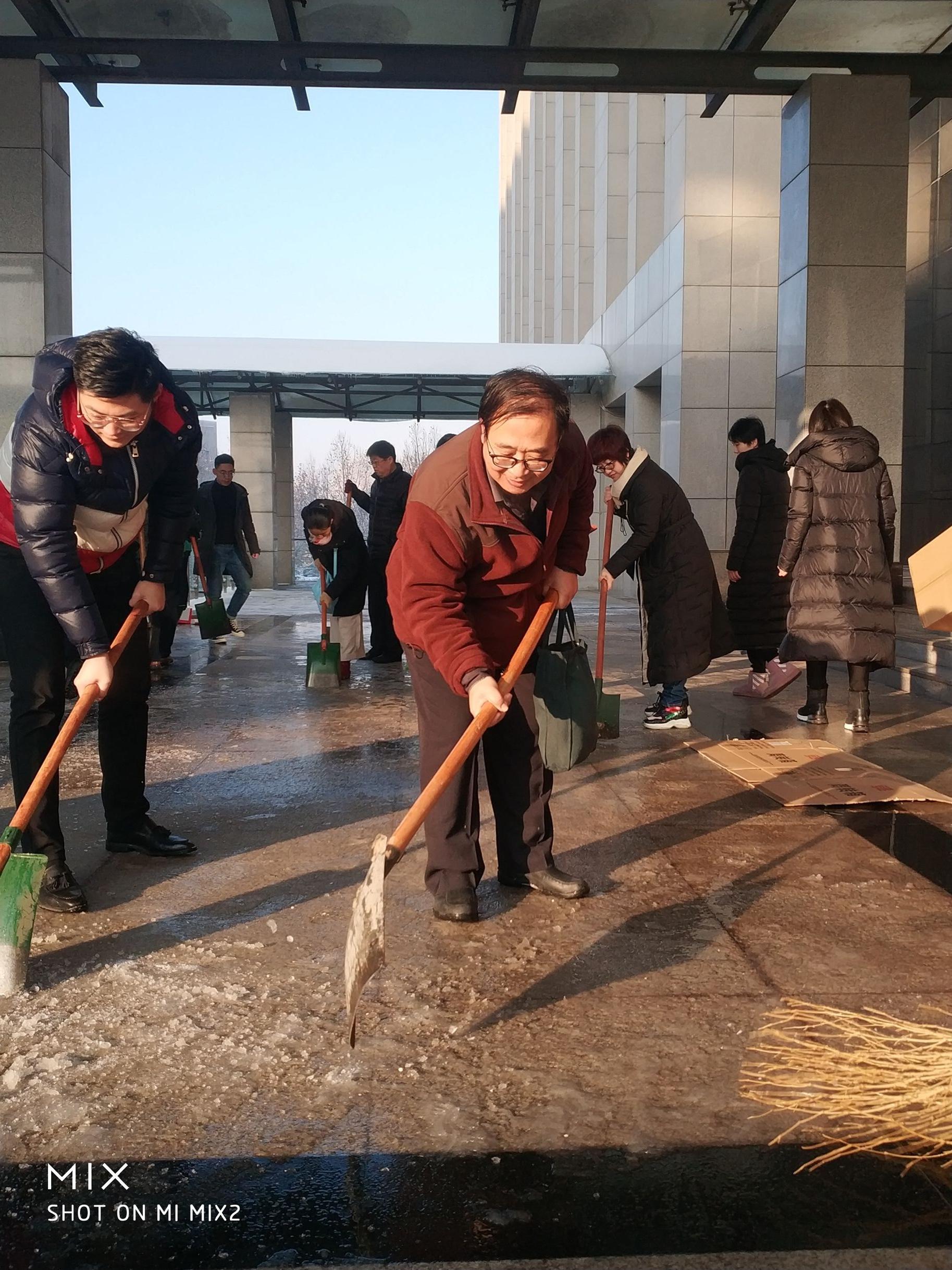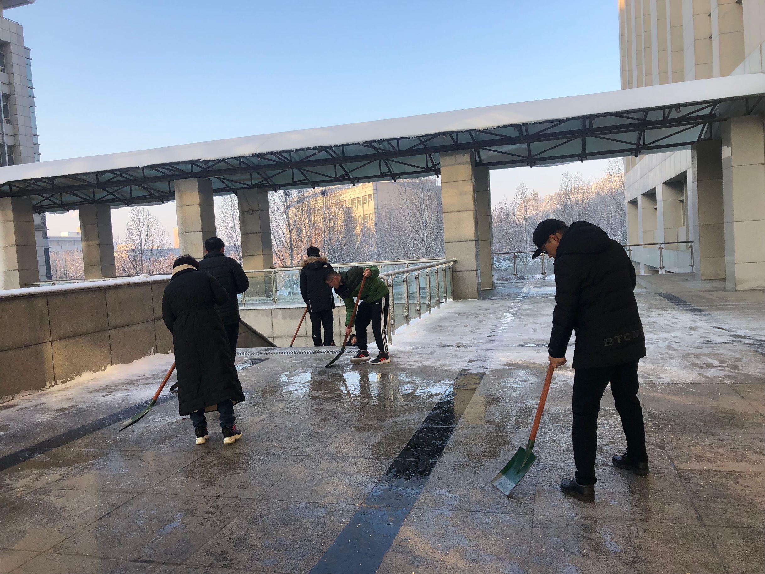 为确保师生安全,1月8日早上,公司领导班子带领公司部分教职工以及员工志愿者积极行动起来,开展扫雪除冰活动,清除公司主干道和周围积雪,方便师生出行。大家手拿铁锨、扫帚等工具,从教学楼前开始,依次沿楼前东西通道、教学楼北侧逐一清理积雪。扫雪现场,老师们齐心协力,配合默契,干得热火朝天。虽然室外温度很低,但大家劳动的热情和团结协作的力量让这个冬日变得格外温暖。经过大家的努力,公司周围道路上的积雪基本清扫干净,为全院师生开辟了一条洋溢着暖暖温情的方便之路,保证了全院师生的出行安全,也呈现出来自公司的温暖和人文关怀。