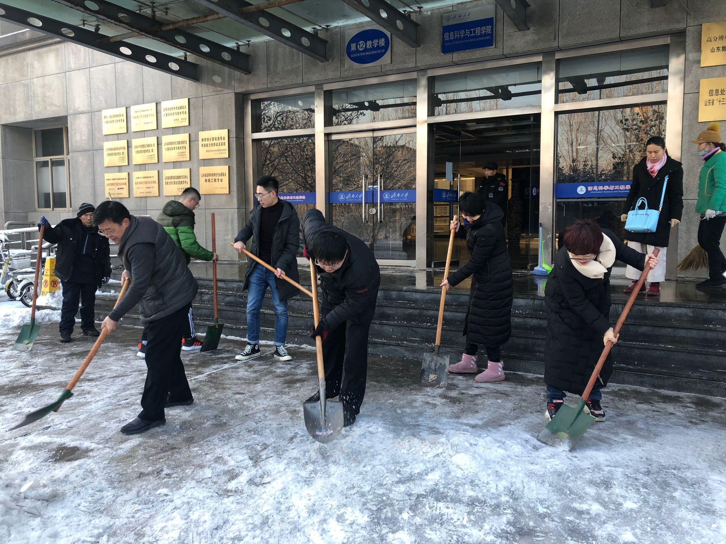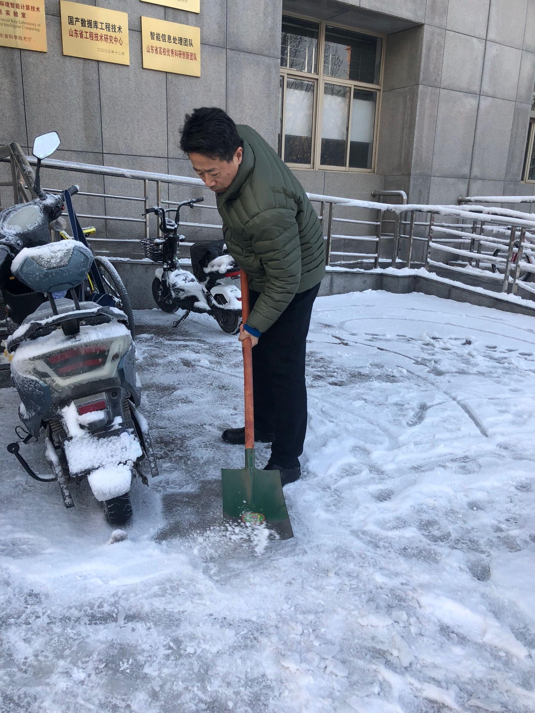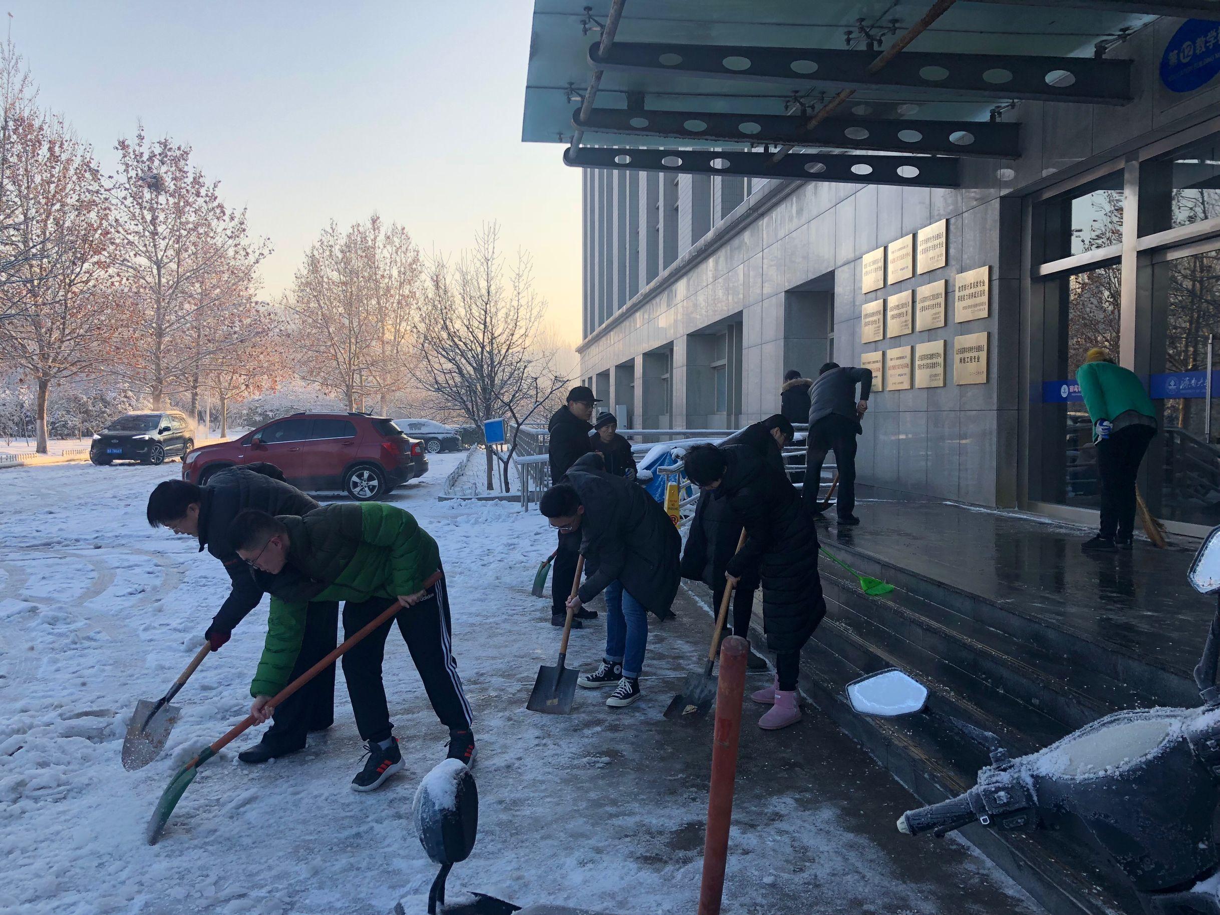 为确保师生安全,1月8日早上,公司领导班子带领公司部分教职工以及员工志愿者积极行动起来,开展扫雪除冰活动,清除公司主干道和周围积雪,方便师生出行。大家手拿铁锨、扫帚等工具,从教学楼前开始,依次沿楼前东西通道、教学楼北侧逐一清理积雪。扫雪现场,老师们齐心协力,配合默契,干得热火朝天。虽然室外温度很低,但大家劳动的热情和团结协作的力量让这个冬日变得格外温暖。经过大家的努力,公司周围道路上的积雪基本清扫干净,为全院师生开辟了一条洋溢着暖暖温情的方便之路,保证了全院师生的出行安全,也呈现出来自公司的温暖和人文关怀。