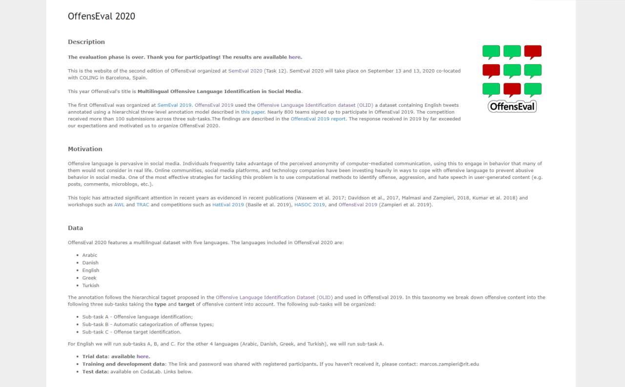 本次比赛,beat365亚洲体育官方网站参赛队伍选择的任务关注点是检测社交媒体文本中的攻击性语言并进行分类。对于此项任务,参赛队伍需要利用官方提供的训练数据集OLID,训练出一个能鉴别用户发布的文本是否是“攻击性言论”的人工智能模型。参赛员工选用了华盛顿大学西雅图分校保罗·艾伦(Paul G.Allen)计算机科学与工程公司和Facebook AI研究院在2019年7月共同发布的A Robustly Optimized BERT Pretraining Approach(RoBERTa)模型。由于模型训练需要大量的算力,指导教师马坤副教授为同学们提供了用于训练的计算资源,保证了模型训练的正常进行。参赛员工在预训练模型的基础上使用自己的数据进行训练和微调。并利用所学知识对预测结果进行分析,反复尝试以寻找最好的数据预处理方式和提高模型效果的方法。参赛团队充分思考了任务模型所需,并采取多种技术手段,最终巧妙的利用模型识别并分类了社交媒体文本中的攻击性语言,从而取得了亮眼的成果。