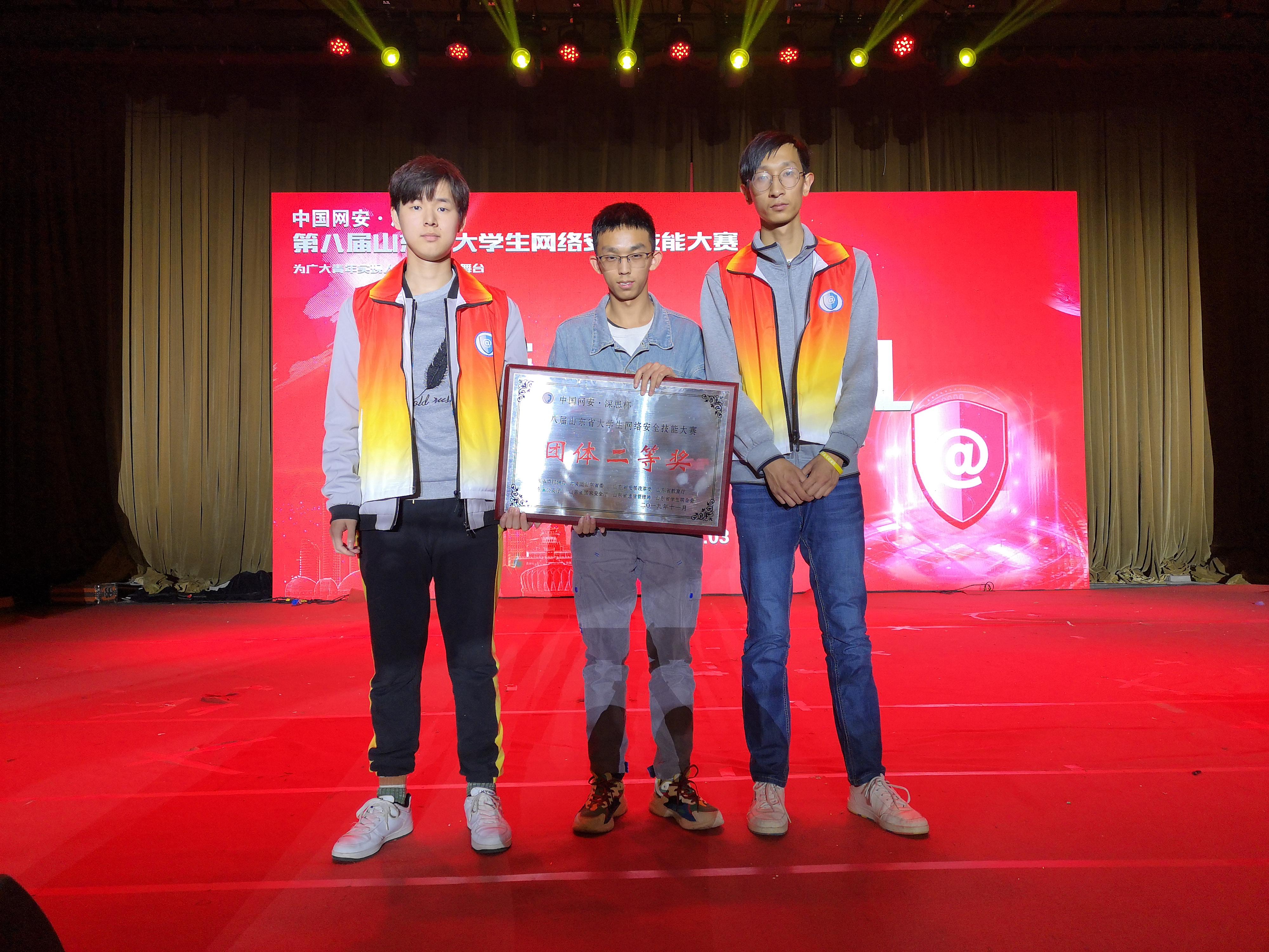 11月3日,由山东省委网信办、共青团山东省委、山东省发展改革委、山东省教育厅、山东省公安厅、山东省国家安全厅、山东省通信管理局、山东省员工联合会主办,山东信息协会、山东政法公司、国家计算机网络与信息安全管理中心山东分中心、山东省社会信用中心承办的中国网安•深思杯第八届山东省老员工网络安全技能大赛在山东政法公司举行。beat365亚洲体育官方网站王倩老师指导带领beat365亚洲体育官方网站赵忠贤、姚鑫、王敏昶三位同学组成的团队荣获团队二等奖,赵忠贤同学获得个人三等奖。