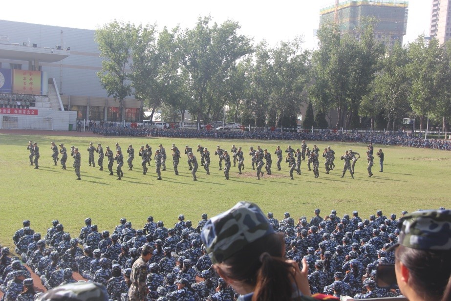 9月21日下午两点,庄严隆重的气氛感染着整个训练场,现场表演的连队意气昂扬,喊着整齐洪亮的口号大步向前。他们目光直射前方,全神贯注地听好教官下达的每一个口令,立正、稍息、齐步、正步,一个个动作迅捷有力,整齐划一。阳光下,整支连队的影子形成一道道层次清晰的直线,节节挺拔坚韧,犹如一排排屹立于高山的青松。经过长期的磨练,队员们学会了相互密切配合,共同顺利完成这场精彩的会操表演。教官一声令下,同学们立即面向两位老师敬礼,董晓宁书记和王群老师亲切地回礼,对同学们获得卓越的训练成果表示祝贺。随后,同学们来到观众席观看军体拳表演,气势宏大的表演群体和雄健灵活的动作激起阵阵响亮的掌声。