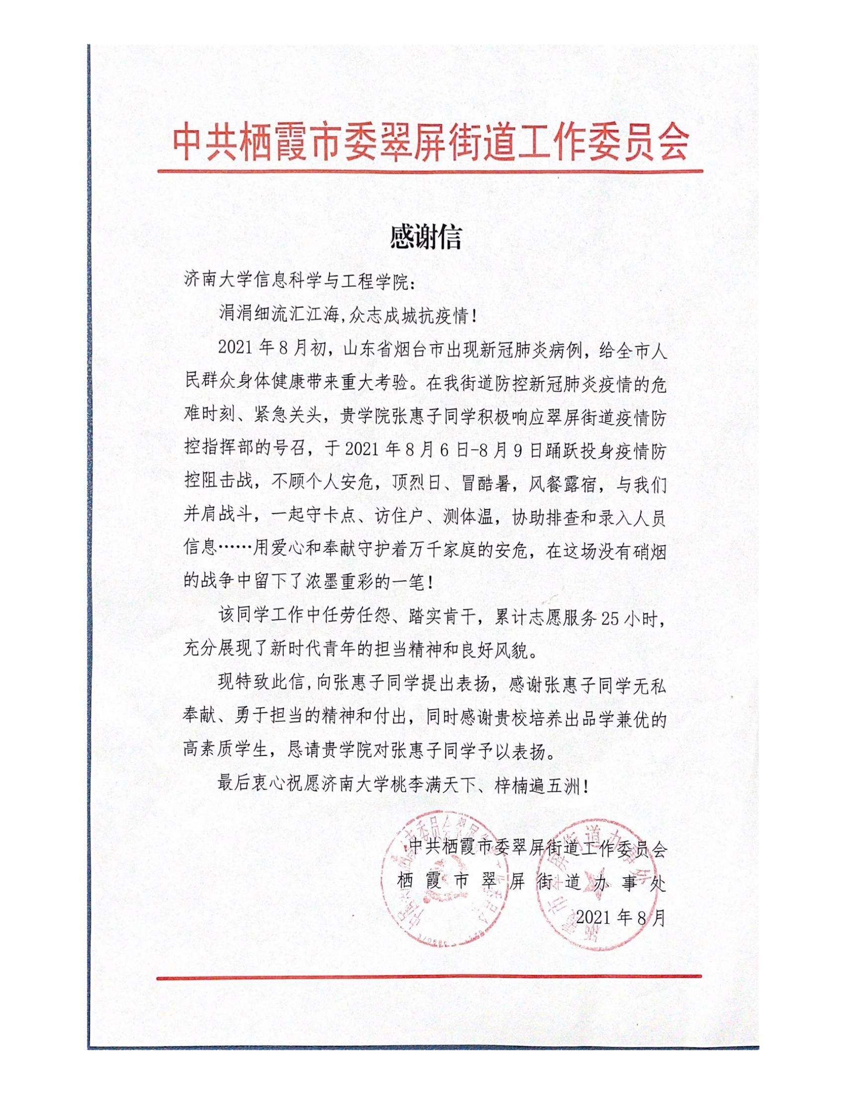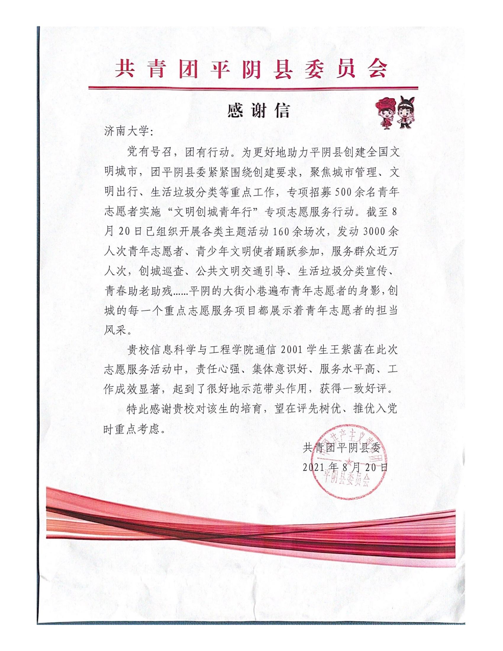 近日,beat365亚洲体育官方网站收到来自共青团平阴县委员会和中共栖霞市翠屏街道工作委员会的感谢信,感谢公司员工王紫菡和张惠子在志愿服务活动中的积极表现以及担当精神。