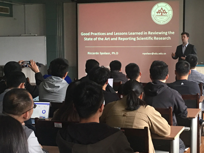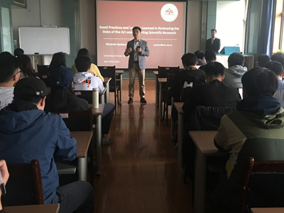 Riccardo作了题为“Good Practices and Lessons Learned in Reviewing the State of the Art and Reporting Scientific Research”的报告。分享了如何从研究到写作正确地构建一篇学术论文,首先分析了计算机科学方面论文的典型结构及其内容,另外介绍了一篇学术论文从投稿到发表所经历的一系列步骤。接着Riccardo分享了如何找到并选择一个感兴趣的研究领域,以及如何开始探索研究现状。最后带领同学们一起探讨了综述这种文献的重要性,何时需要阅读或撰写综述,以及撰写综述时需要注意的事项。在报告之中Riccardo还穿插了一些诸如如何处理与导师的关系以及作为研究生应该具备的基本素养之类的话题。分享妙趣横生,同学们也都收获颇丰。最后,Riccardo就老师和同学们提出的相关问题进行了交流。