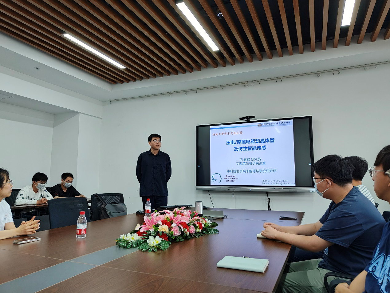 生活环境中充满了各种各样的能量,例如震动能,形变能,化学能,生物能,微风能,太阳能,热能等。如果利用纳米技术可以把这些无时不刻存在的能量转换为电能来驱动电子器件,就可以制造出自驱动的微纳系统。压电/摩擦纳米发电机可以将外界机械能转化为电能,对其脉冲输出整流后可给微型电子设备供能,在移动通讯、移动能源、健康监测、环境监测、国防技术、智能键盘、人机界面、医学诊断、物联网及大数据等方面取得了巨大的成就。当压电/摩擦纳米发电机的电场和电容式器件(例如,场效应晶体管FET)耦合时,压电/摩擦电势可有效调控沟道的费米能级和载流子输运。利用压电/摩擦电势和半导体器件耦合催生了一个新兴的交叉学科---压电(摩擦)电子学。基于此,衍生出了一系列外部机械行为调控的新型半导体器件,例如主动式电子皮肤传感器、人工神经传感突触、微机电逻辑器件、触觉传感器、摩擦光电晶体管、以及机械写入存储器等。基于此,孙其君研究员在报告会上详细地介绍了其课题组在压电/摩擦电调控场效应晶体管和人工智能传感领域的相关成果,并对该领域的未来发展作了展望,使师生们获益良多。报告会后,孙其君研究员与参会师生进行了充分交流,并耐心解答了老师员工们的提问。