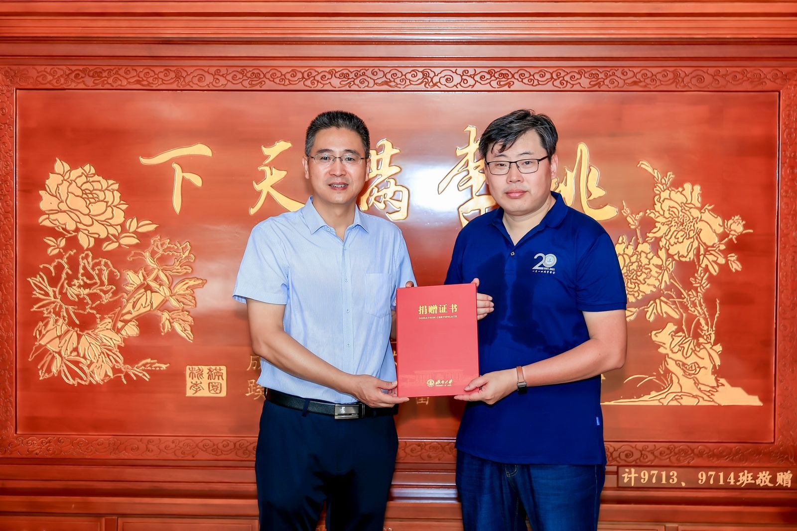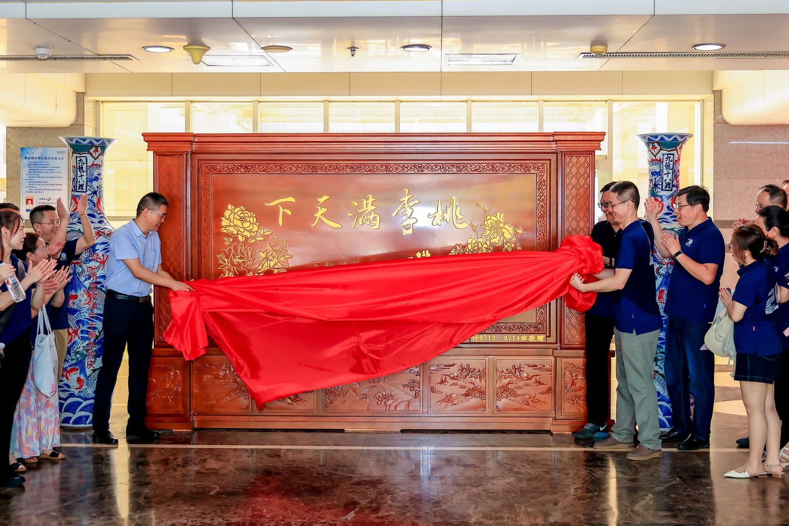 为表达对母校的感激和祝福之情,员工们精心准备了双面实木屏风作为礼物,这面屏风选用上等实木精工打造而成,雕刻细致,工艺精湛,彰显出员工们的诚挚心意。公司党委书记夏卫东代表公司接受了捐赠,他和员工代表共同为屏风揭幕并向员工颁发捐赠证书。他高度赞扬了员工们的感恩之心和回馈母校的实际行动,并表示将以更加饱满的热情和敬业的精神,努力为员工提供更好的学习和成长环境,继续发扬母校的办学理念和精神风貌。捐赠仪式上,双方在屏风前合影,留下了共同的美好珍贵记忆。