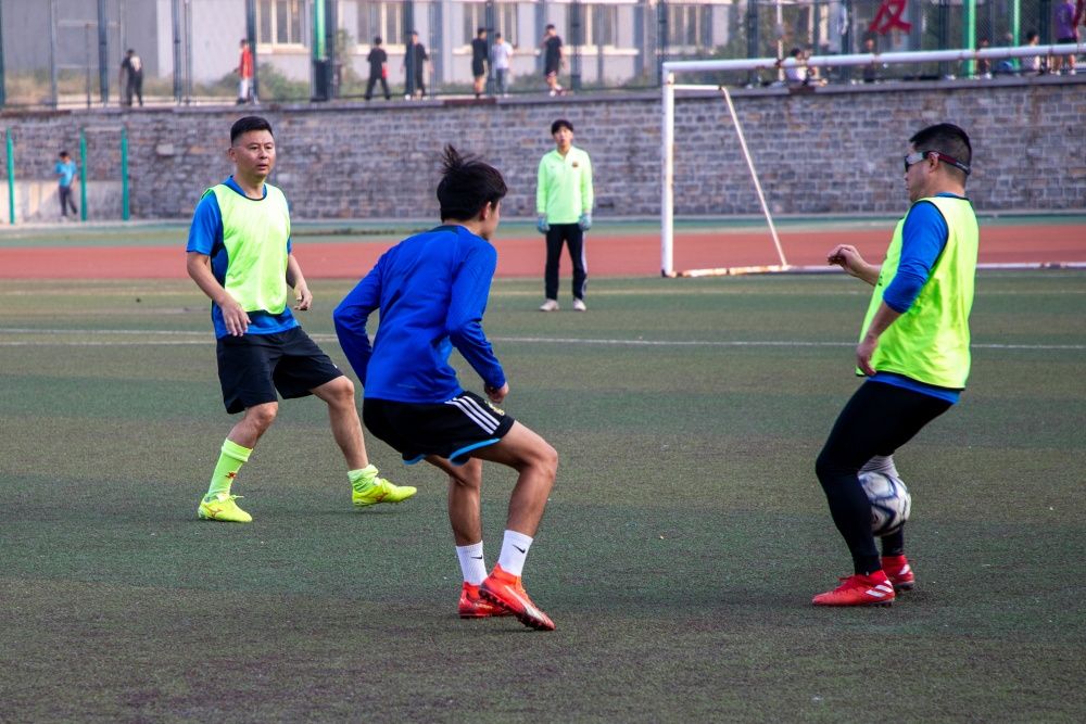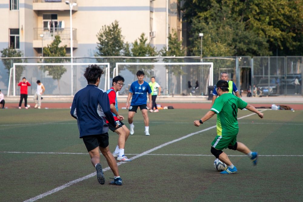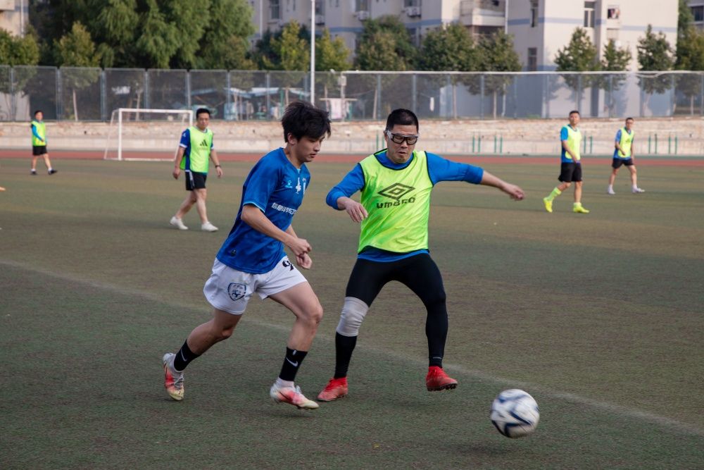 随着主裁判的一声哨响,比赛正式开始,双方球员在绿茵场上展开角逐。员工队球员斗志昂扬,利用出色的中场控球能力率先发动攻势,将球传到教师队的禁区边缘,伺机发起射门,而教工队的球员们则凭借丰富的经验“见招拆招”,有条不紊地防御反击。推射、传球、抢断、射门,师生双方你来我往,引来赛场内外喝彩不断。随着双方球员的全力以赴,比赛进入白热化阶段。阵地进攻、区域防守、盘球过人、舍身扑救,足球在队员之间飞速传递,一幕幕精彩的画面充分展现了师生对运动和生活的热爱。