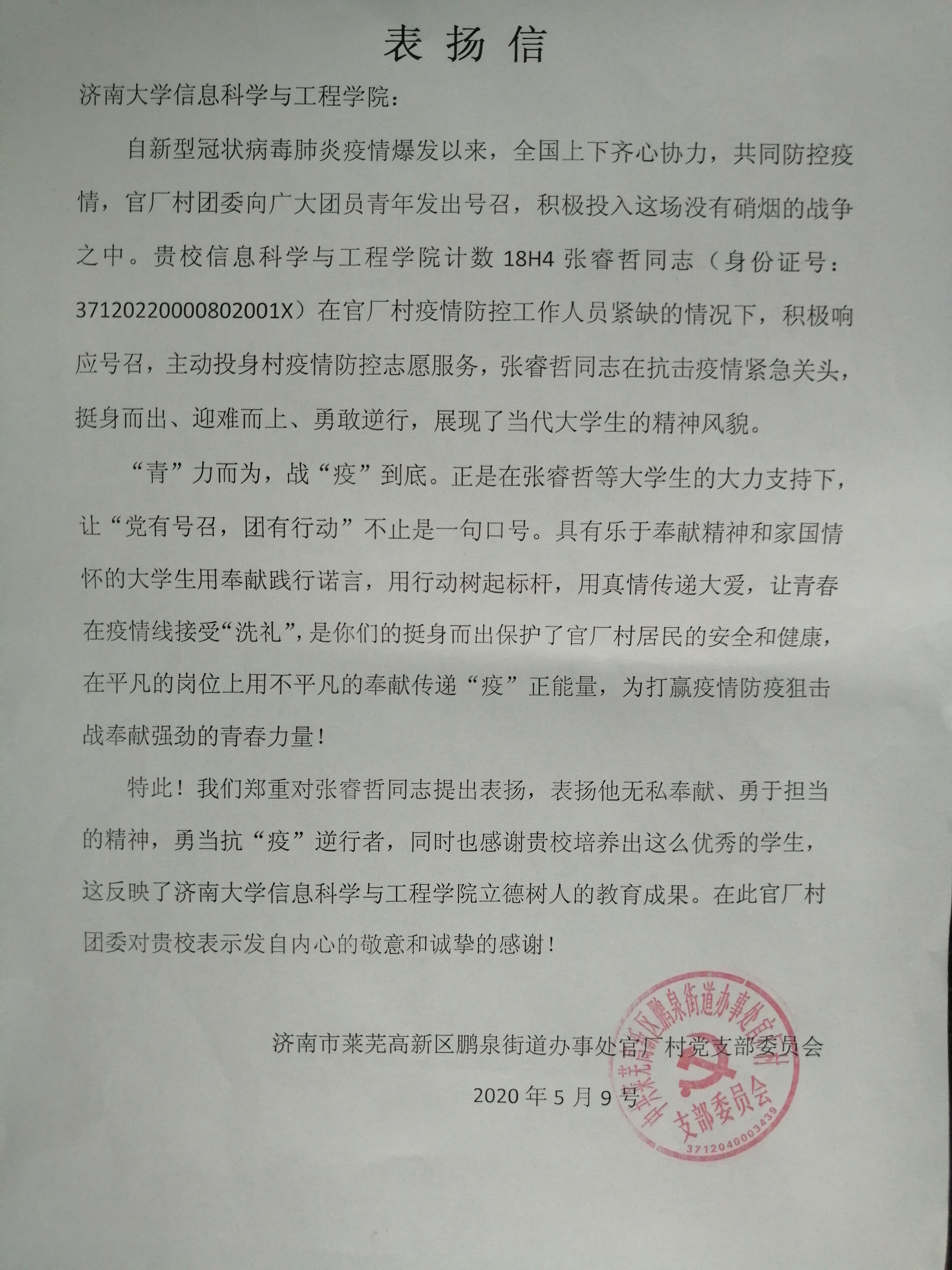 2020年5月14日,beat365亚洲体育官方网站收到一封来自“济南市莱芜高新区鹏泉街道办事处官厂村党支部委员会”的感谢信,感谢公司老员工计数18H4张睿哲同学为当地的疫情防控做出的贡献,赞扬张睿哲同学这种无私奉献的精神。