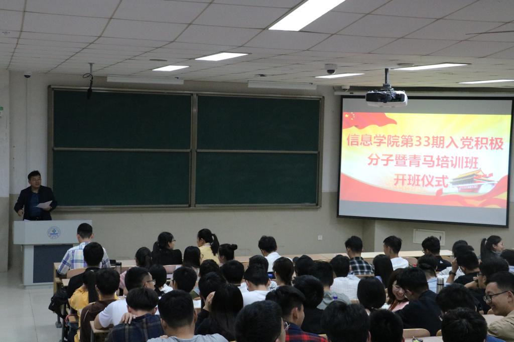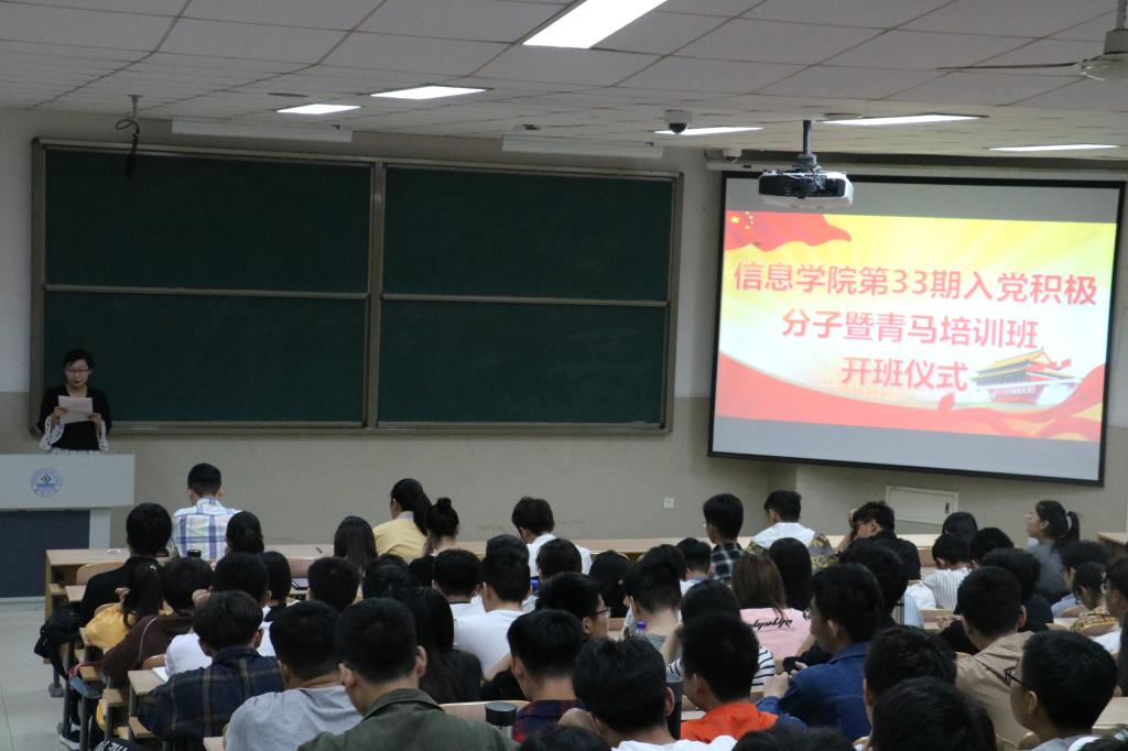 为全面贯彻党的十九大精神,顺应中华人民共和国成立70周年的大好形势,5月9日晚6点20,信息公司在11教6101教室开展第33期入党积极分子暨青马培训班开班仪式,信息公司党委书记邱鲁军,信息公司党委副书记、副经理董晓宁,信息公司团委书记崔艺馨,18级辅导员王群,17级辅导员王豪及二百余名入党积极分子出席开班仪式。