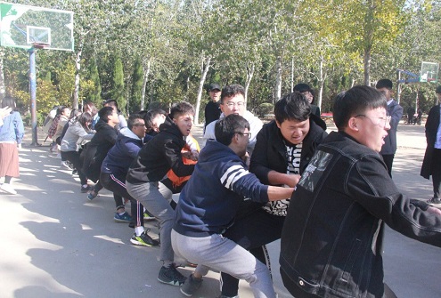 27日上午八点半,南苑水泥篮球场上比赛气氛紧张而活跃,现场洋溢着欢愉的气息,各班参赛队员个个精神抖擞,跃跃欲试,鼓足了劲准备齐心协力,勇争第一。比赛开始前,双方队员就已经进入了战斗状态,双手紧握麻绳,两脚牢牢贴地,身体向后微倾。哨声一响,队员们口号震天,气势轩昂,齐心协力的精神凝成了一股绳。有的同学脸憋得通红却丝毫不放松,有的"面部狰狞"使尽浑身解数,还有的干脆闭上眼睛卯足了劲儿往后拉。女同学们更不甘示弱,一个个咬紧牙关,将巾帼不让须眉的精神风貌发扬得淋漓尽致。一旁加油喝彩的观众组成了强大的后援团,加油声、呐喊声、助威声直入云霄。经过激烈角逐,计智1、2班夺得冠军,电子3、4班荣获亚军,电子1、2班获季军。