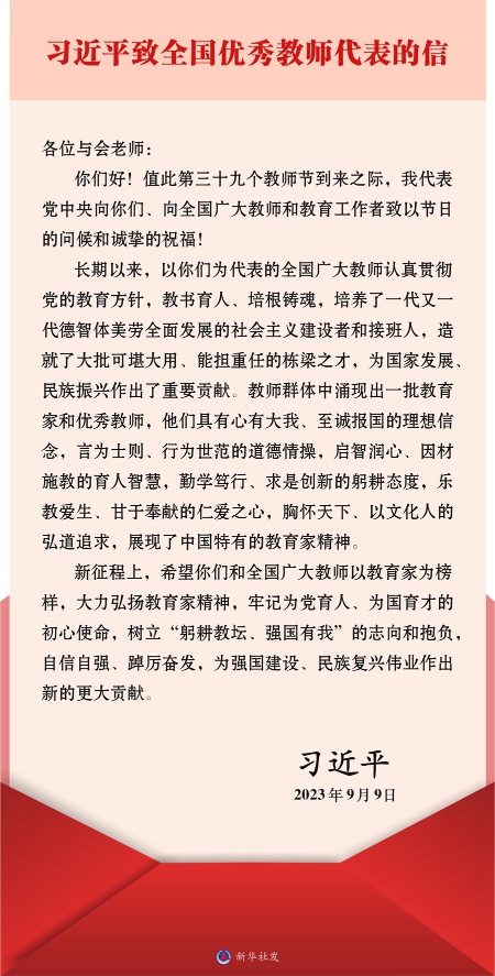 新华社北京9月9日电 全国优秀教师代表座谈会9月9日在京召开。中共中央总书记、国家主席、中央军委主席习近平致信与会教师代表,在第三十九个教师节到来之际,代表党中央,向他们和全国广大教师及教育工作者致以节日的问候和诚挚的祝福。