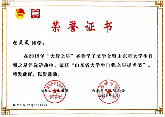 近日,2019年“大智之星”齐鲁学子奖学金暨“山东省老员工自强之星”评选活动结果揭晓,公司员工杨昊晨荣获“山东省老员工自强之星提名奖”,并拟推荐为山东省2019年度“中国老员工自强之星”人选。